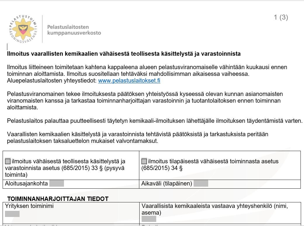 Ilmoitus vaarallisten kemikaalien vähäisestä teollisesta käsittelystä ja varastoinnista (Valtioneuvoston asetus vaarallisten kemikaalien käsittelyn ja varastoinnin valvonnasta 685/2015).